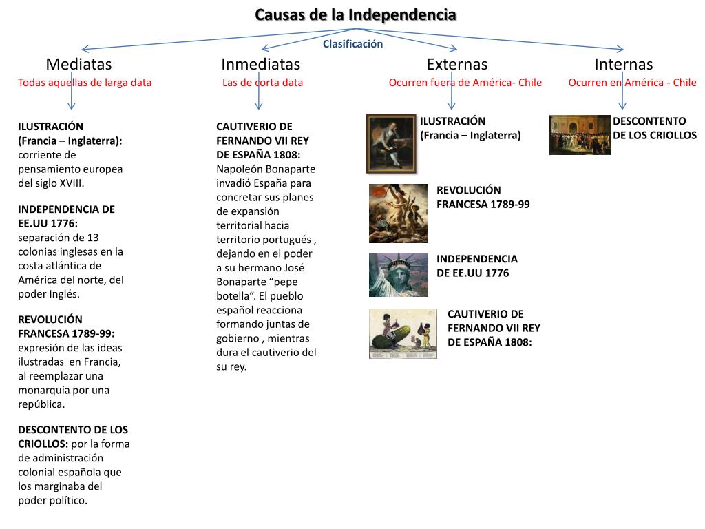 Causas de la Independencia Clasificación Mediatas Inmediatas Externas Internas Todas aquellas de larga data Las de corta data Ocurren fuera de América- Chile Ocurren en América - Chile ILUSTRACIÓN(Francia – Inglaterra) DESCONTENTO DE LOS CRIOLLOS ILUSTRACIÓN(Francia – Inglaterra): corriente de pensamiento europea del siglo XVIII. CAUTIVERIO DE FERNANDO VII REY DE ESPAÑA 1808: Napoleón Bonaparte invadió España para concretar sus planes de expansión territorial hacia territorio portugués , dejando en el poder a su hermano José Bonaparte “pepe botella”. El pueblo español reacciona formando juntas de gobierno , mientras dura el cautiverio del su rey. REVOLUCIÓN FRANCESA 1789-99 INDEPENDENCIA DE EE.UU 1776: separación de 13 colonias inglesas en la costa atlántica de América del norte, del poder Inglés. INDEPENDENCIA DE EE.UU 1776 CAUTIVERIO DE FERNANDO VII REY DE ESPAÑA 1808: REVOLUCIÓN FRANCESA 1789-99: expresión de las ideas ilustradas en Francia, al reemplazar una monarquía por una república. DESCONTENTO DE LOS CRIOLLOS: por la forma de administración colonial española que los marginaba del poder político.