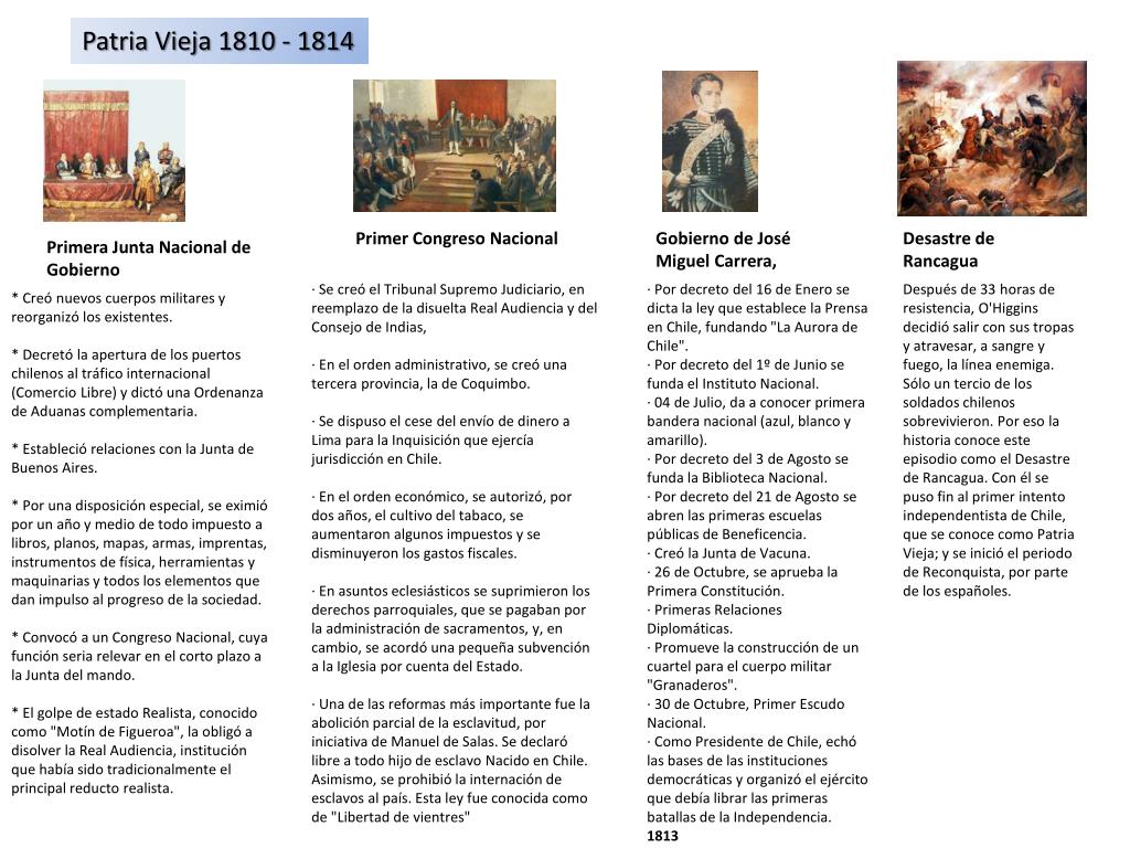 Patria Vieja 1810 - 1814 Primer Congreso Nacional Gobierno de José Miguel Carrera, Desastre de Rancagua Primera Junta Nacional de Gobierno · Se creó el Tribunal Supremo Judiciario, en reemplazo de la disuelta Real Audiencia y del Consejo de Indias, · En el orden administrativo, se creó una tercera provincia, la de Coquimbo. · Se dispuso el cese del envío de dinero a Lima para la Inquisición que ejercía jurisdicción en Chile. · En el orden económico, se autorizó, por dos años, el cultivo del tabaco, se aumentaron algunos impuestos y se disminuyeron los gastos fiscales. · En asuntos eclesiásticos se suprimieron los derechos parroquiales, que se pagaban por la administración de sacramentos, y, en cambio, se acordó una pequeña subvención a la Iglesia por cuenta del Estado. · Una de las reformas más importante fue la abolición parcial de la esclavitud, por iniciativa de Manuel de Salas. Se declaró libre a todo hijo de esclavo Nacido en Chile. Asimismo, se prohibió la internación de esclavos al país. Esta ley fue conocida como de "Libertad de vientres" · Por decreto del 16 de Enero se dicta la ley que establece la Prensa en Chile, fundando "La Aurora de Chile". · Por decreto del 1º de Junio se funda el Instituto Nacional. · 04 de Julio, da a conocer primera bandera nacional (azul, blanco y amarillo). · Por decreto del 3 de Agosto se funda la Biblioteca Nacional. · Por decreto del 21 de Agosto se abren las primeras escuelas públicas de Beneficencia. · Creó la Junta de Vacuna. · 26 de Octubre, se aprueba la Primera Constitución. · Primeras Relaciones Diplomáticas. · Promueve la construcción de un cuartel para el cuerpo militar "Granaderos". · 30 de Octubre, Primer Escudo Nacional. · Como Presidente de Chile, echó las bases de las instituciones democráticas y organizó el ejército que debía librar las primeras batallas de la Independencia. 1813 Después de 33 horas de resistencia, O'Higgins decidió salir con sus tropas y atravesar, a sangre y fuego, la línea enemiga. Sólo un tercio de los soldados chilenos sobrevivieron. Por eso la historia conoce este episodio como el Desastre de Rancagua. Con él se puso fin al primer intento independentista de Chile, que se conoce como Patria Vieja; y se inició el periodo de Reconquista, por parte de los españoles. * Creó nuevos cuerpos militares y reorganizó los existentes. * Decretó la apertura de los puertos chilenos al tráfico internacional (Comercio Libre) y dictó una Ordenanza de Aduanas complementaria. * Estableció relaciones con la Junta de Buenos Aires. * Por una disposición especial, se eximió por un año y medio de todo impuesto a libros, planos, mapas, armas, imprentas, instrumentos de física, herramientas y maquinarias y todos los elementos que dan impulso al progreso de la sociedad. * Convocó a un Congreso Nacional, cuya función seria relevar en el corto plazo a la Junta del mando. * El golpe de estado Realista, conocido como "Motín de Figueroa", la obligó a disolver la Real Audiencia, institución que había sido tradicionalmente el principal reducto realista.