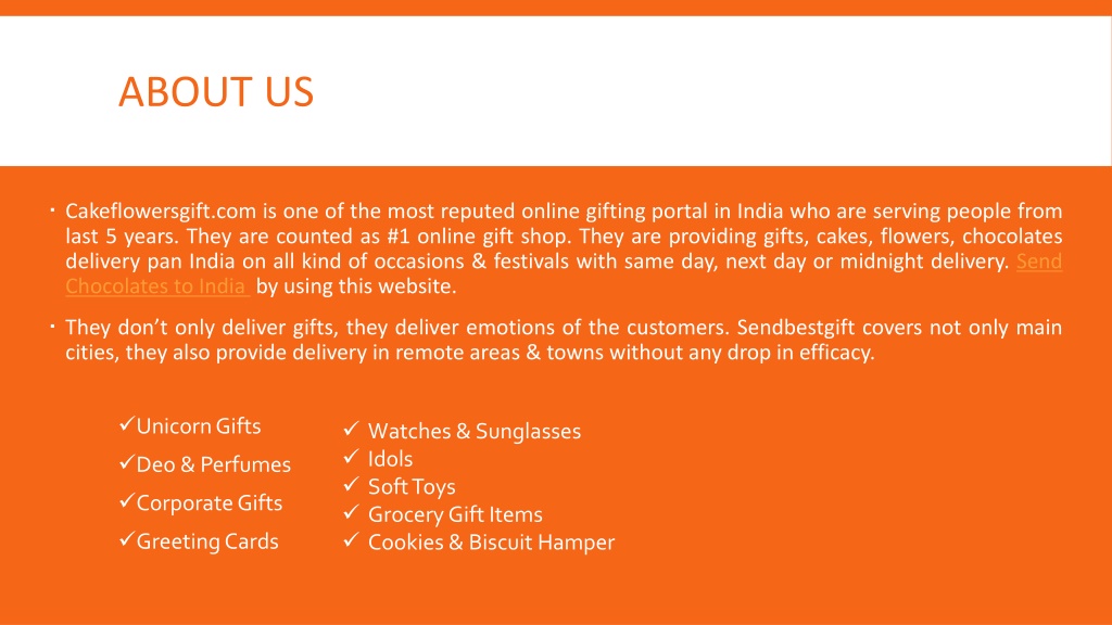 About Us • Cakeflowersgift.com is one of the most reputed online gifting portal in India who are serving people from last 5 years. They are counted as #1 online gift shop. They are providing gifts, cakes, flowers, chocolates delivery pan India on all kind of occasions & festivals with same day, next day or midnight delivery. Send Chocolates to India by using this website. • They don’t only deliver gifts, they deliver emotions of the customers. Sendbestgift covers not only main cities, they also provide delivery in remote areas & towns without any drop in efficacy. • Unicorn Gifts • Deo & Perfumes • Corporate Gifts • Greeting Cards • Watches & Sunglasses • Idols • Soft Toys • Grocery Gift Items • Cookies & Biscuit Hamper