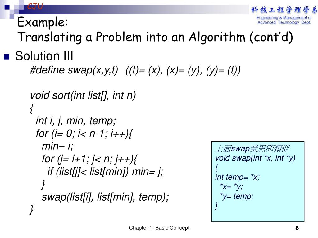 Example:Translating a Problem into an Algorithm (cont’d) #define swap(x,y,t) ((t)= (x), (x)= (y), (y)= (t)) void sort(int list[], int n) { int i, j, min, temp; for (i= 0; i< n-1; i++){ min= i; for (j= i+1; j< n; j++){ if (list[j]< list[min]) min= j; } swap(list[i], list[min], temp); } • Solution III 上面swap意思即類似 void swap(int *x, int *y) { int temp= *x; *x= *y; *y= temp; } Chapter 1: Basic Concept