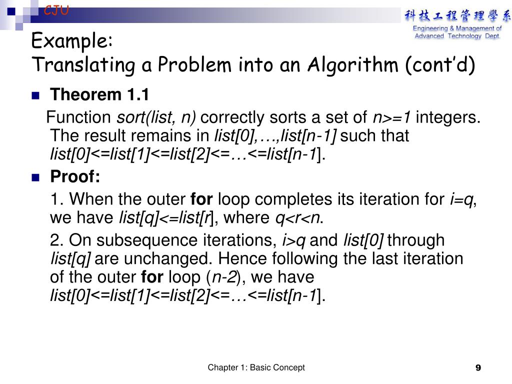 Example:Translating a Problem into an Algorithm (cont’d) • Theorem 1.1 Function sort(list, n) correctly sorts a set of n>=1 integers. The result remains in list[0],…,list[n-1] such that list[0]<=list[1]<=list[2]<=…<=list[n-1]. • Proof: 1. When the outer for loop completes its iteration for i=q, we have list[q]<=list[r], where q<r<n. 2. On subsequence iterations, i>q and list[0] through list[q] are unchanged. Hence following the last iteration of the outer for loop (n-2), we have list[0]<=list[1]<=list[2]<=…<=list[n-1]. Chapter 1: Basic Concept