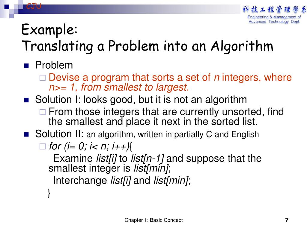 Example:Translating a Problem into an Algorithm • Problem • Devise a program that sorts a set of n integers, where n>= 1, from smallest to largest. • Solution I: looks good, but it is not an algorithm • From those integers that are currently unsorted, find the smallest and place it next in the sorted list. • Solution II: an algorithm, written in partially C and English • for (i= 0; i< n; i++){ Examine list[i] to list[n-1] and suppose that the smallest integer is list[min]; Interchange list[i] and list[min]; } Chapter 1: Basic Concept