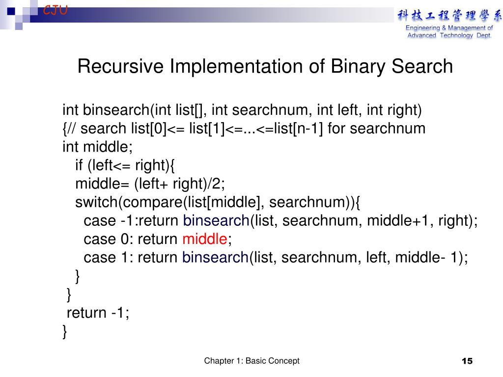 Recursive Implementation of Binary Search int binsearch(int list[], int searchnum, int left, int right) {// search list[0]<= list[1]<=...<=list[n-1] for searchnum int middle; if (left<= right){ middle= (left+ right)/2; switch(compare(list[middle], searchnum)){ case -1:return binsearch(list, searchnum, middle+1, right); case 0: return middle; case 1: return binsearch(list, searchnum, left, middle- 1); } } return -1; } Chapter 1: Basic Concept