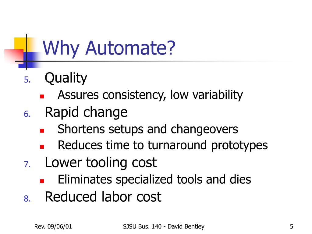 Why Automate? • Quality • Assures consistency, low variability • Rapid change • Shortens setups and changeovers • Reduces time to turnaround prototypes • Lower tooling cost • Eliminates specialized tools and dies • Reduced labor cost SJSU Bus. 140 - David Bentley