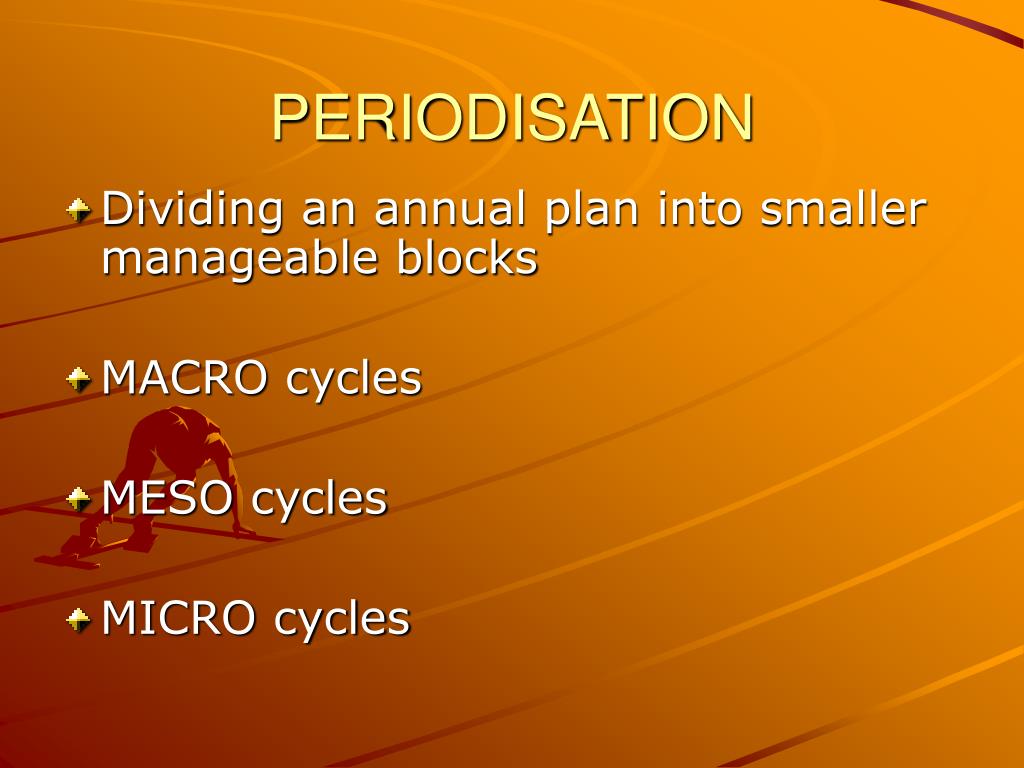PERIODISATION • Dividing an annual plan into smaller manageable blocks • MACRO cycles • MESO cycles • MICRO cycles