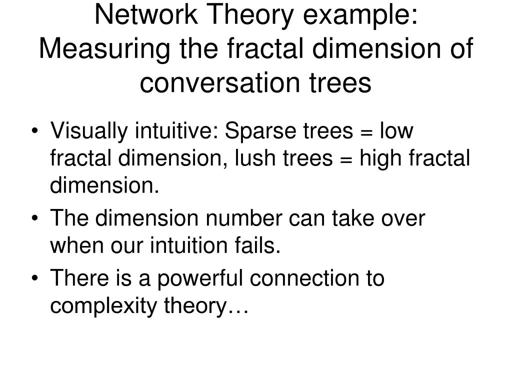 Network Theory example:Measuring the fractal dimension of conversation trees • Visually intuitive: Sparse trees = low fractal dimension, lush trees = high fractal dimension. • The dimension number can take over when our intuition fails. • There is a powerful connection to complexity theory…
