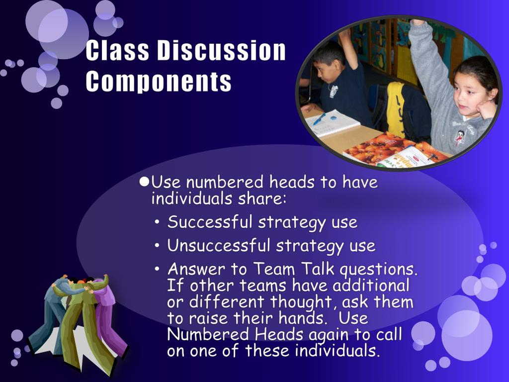 Class DiscussionComponents • Use numbered heads to have individuals share: • Successful strategy use • Unsuccessful strategy use • Answer to Team Talk questions. If other teams have additional or different thought, ask them to raise their hands. Use Numbered Heads again to call on one of these individuals.