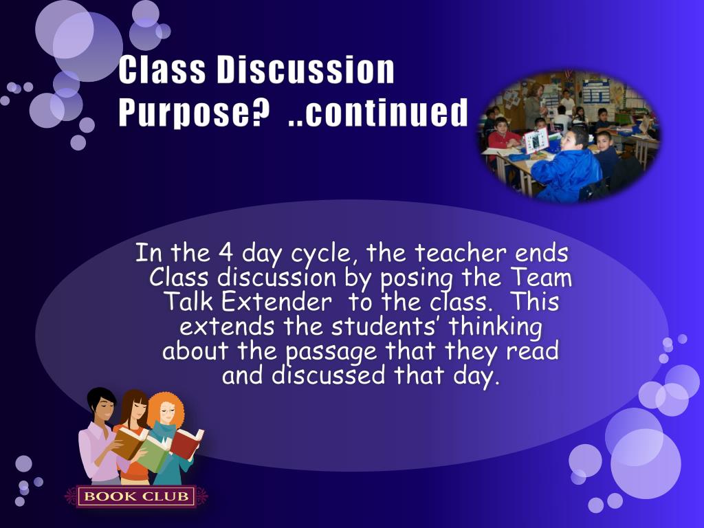 Class DiscussionPurpose? ..continued In the 4 day cycle, the teacher ends Class discussion by posing the Team Talk Extender to the class. This extends the students’ thinking about the passage that they read and discussed that day.