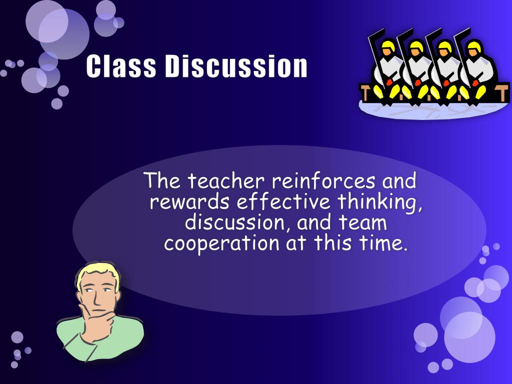 Class Discussion The teacher reinforces and rewards effective thinking, discussion, and team cooperation at this time.