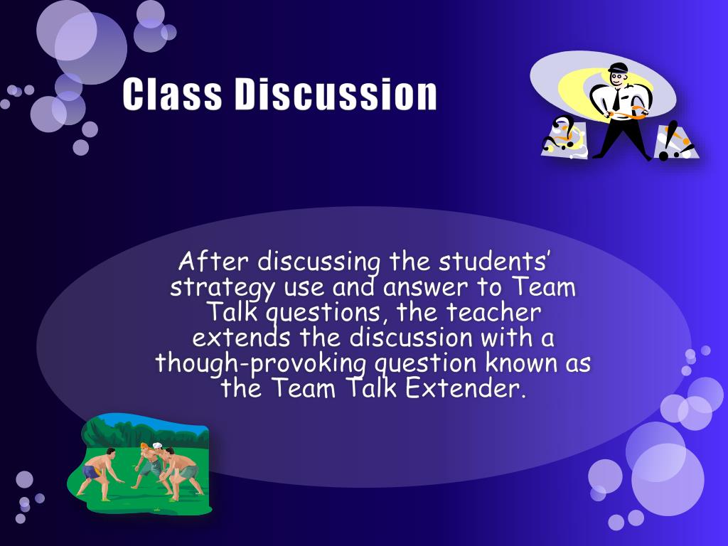 Class Discussion After discussing the students’ strategy use and answer to Team Talk questions, the teacher extends the discussion with a though-provoking question known as the Team Talk Extender.