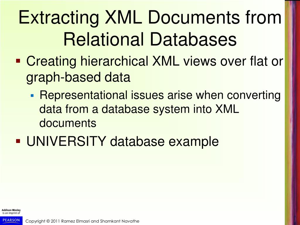 Extracting XML Documents from Relational Databases • Creating hierarchical XML views over flat or graph-based data • Representational issues arise when converting data from a database system into XML documents • UNIVERSITY database example