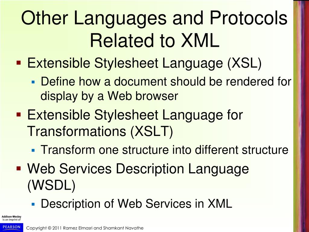 Other Languages and Protocols Related to XML • Extensible Stylesheet Language (XSL) • Define how a document should be rendered for display by a Web browser • Extensible Stylesheet Language for Transformations (XSLT) • Transform one structure into different structure • Web Services Description Language (WSDL) • Description of Web Services in XML