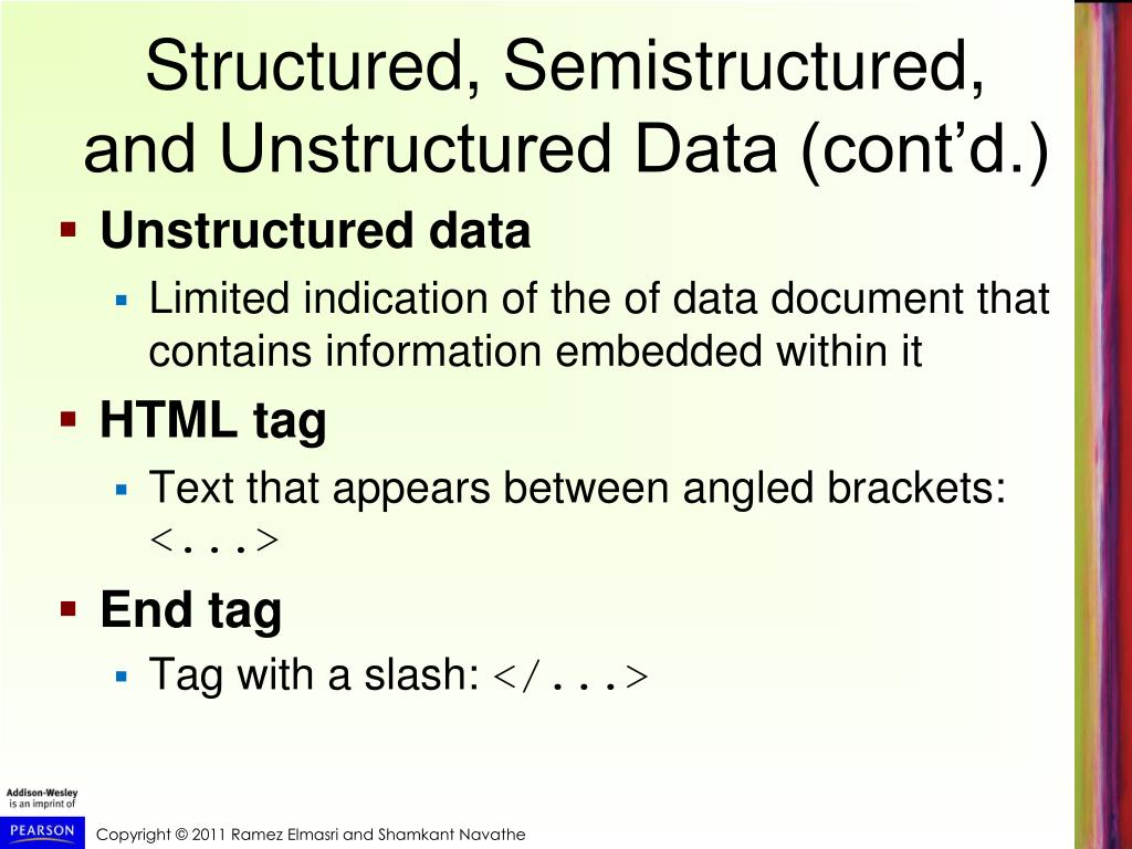 Structured, Semistructured,and Unstructured Data (cont’d.) • HTML uses a large number of predefined tags • HTML documents • Do not include schema information about type of data • Static HTML page • All information to be displayed explicitly spelled out as fixed text in HTML file