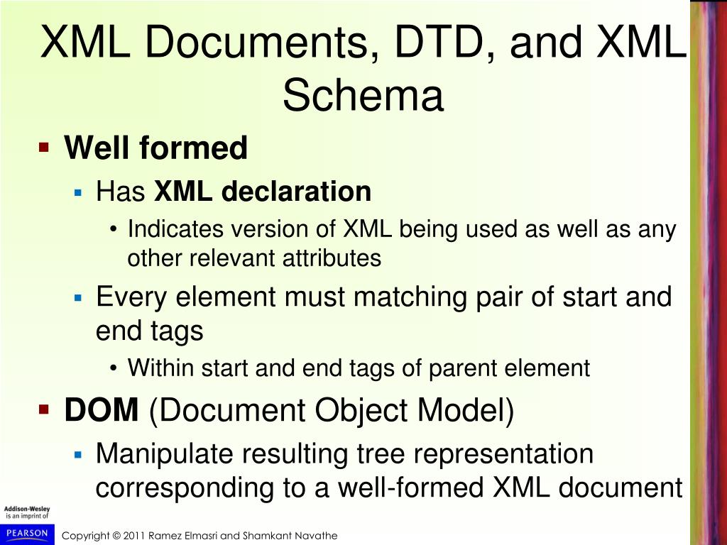 XML Documents, DTD, and XML Schema • Well formed • Has XML declaration • Indicates version of XML being used as well as any other relevant attributes • Every element must matching pair of start and end tags • Within start and end tags of parent element • DOM (Document Object Model) • Manipulate resulting tree representation corresponding to a well-formed XML document