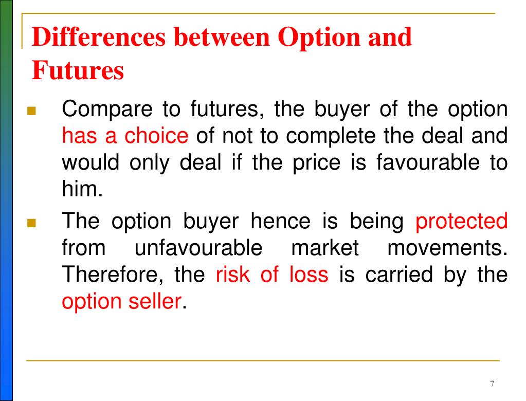 Differences between Option and Futures • Compare to futures, the buyer of the option has a choice of not to complete the deal and would only deal if the price is favourable to him. • The option buyer hence is being protected from unfavourable market movements. Therefore, the risk of loss is carried by the option seller.