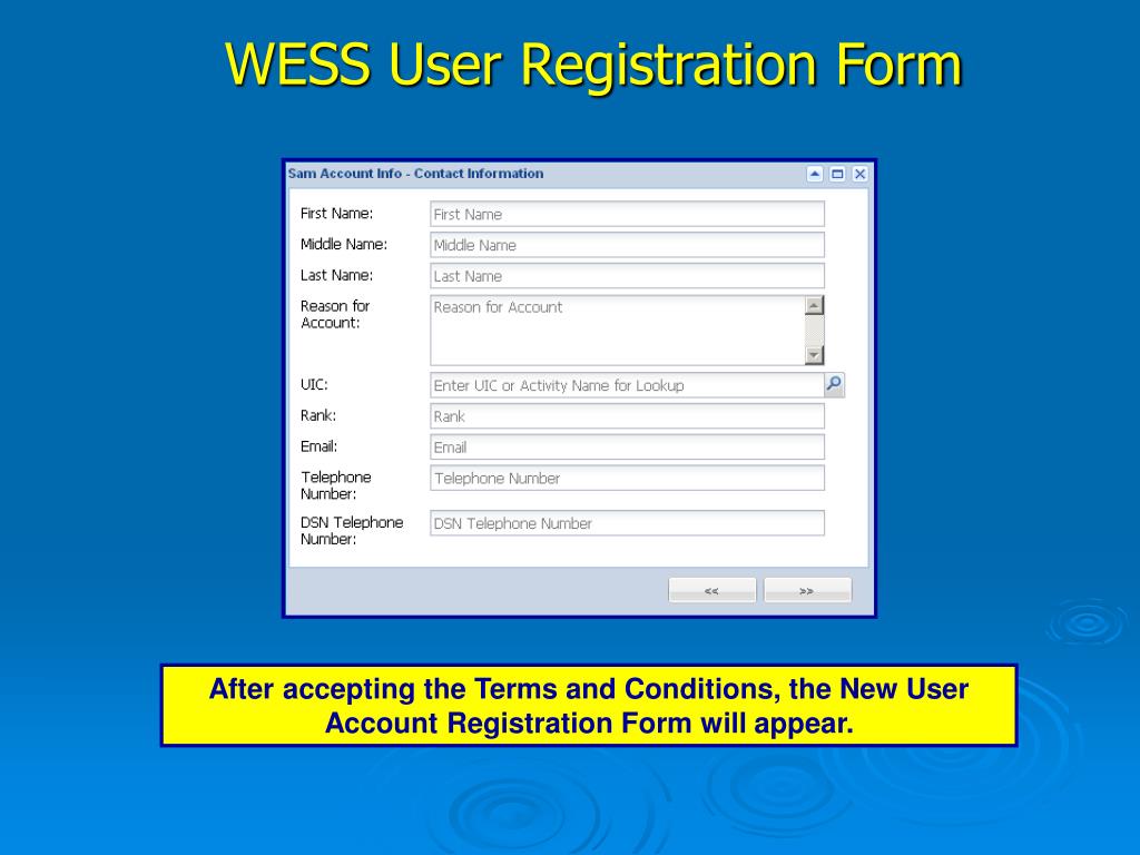 WESS User Registration Form After accepting the Terms and Conditions, the New User Account Registration Form will appear.