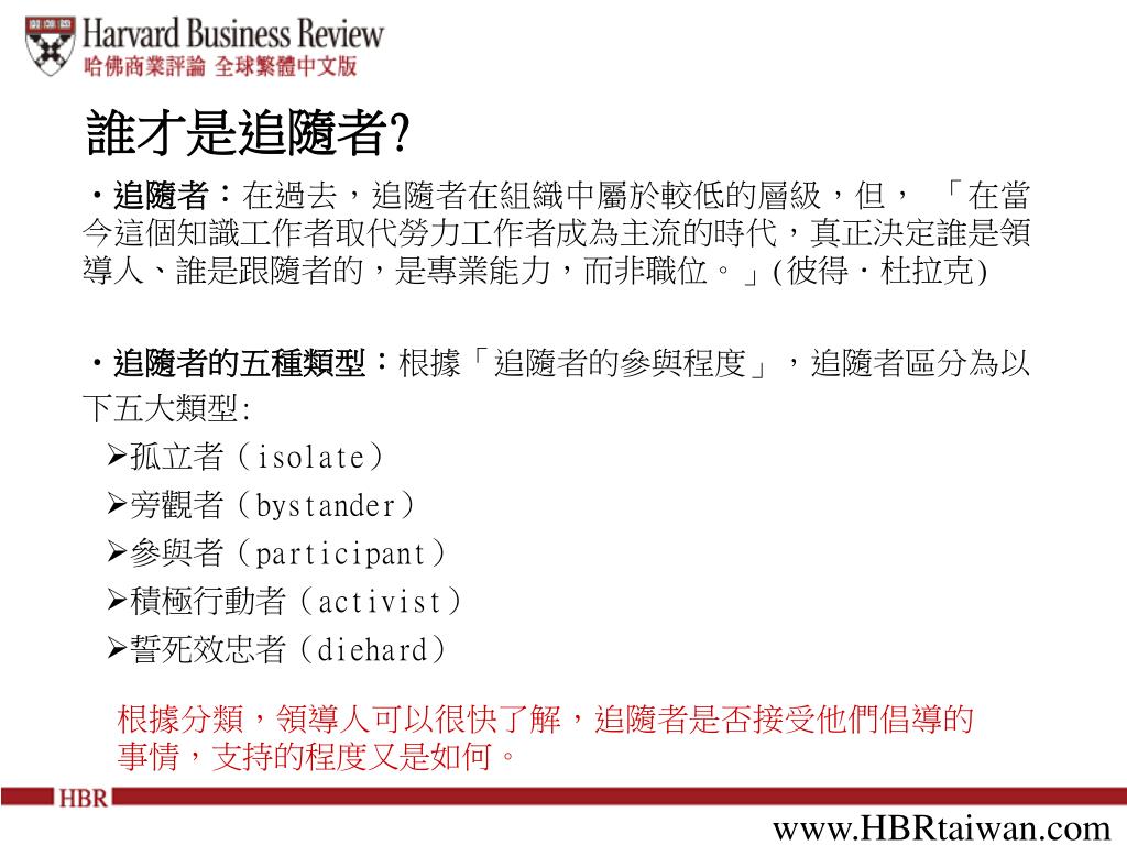所謂領導人,至少要有一個 追隨者( follower ) , 成功的領導人必須了解追隨者, 區隔不同的追隨者,與區隔不同的領導人一樣重要, 這對經理人如何管理追隨者, 有極大的啟示。 . 本文 並提供員工的分類法,讓領導人有分類的依據,了解每個員工不同之處,進而採取有效的領導之道。. 誰才是追隨者 ?. 追隨者: 在過去,追隨者在組織中屬於較低的層級,但, 「在當今這個知識工作者取代勞力工作者成為主流的時代,真正決定誰是領導人、誰是跟隨者的,是專業能力,而非職位。」 ( 彼得.杜拉克 ) 追隨者的五種類型: 根據「追隨者的參與程度」,追隨者區分為以下五大類型 :