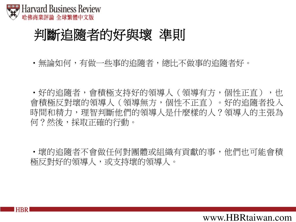 判斷追隨者的好與壞 準則 • 無論如何,有做一些事的追隨者,總比不做事的追隨者好。 • 好的追隨者,會積極支持好的領導人(領導有方,個性正直),也會積極反對壞的領導人(領導無方,個性不正直)。好的追隨者投入時間和精力,理智判斷他們的領導人是什麼樣的人?領導人的主張為何?然後,採取正確的行動。 • 壞的追隨者不會做任何對團體或組織有貢獻的事,他們也可能會積極反對好的領導人,或支持壞的領導人。