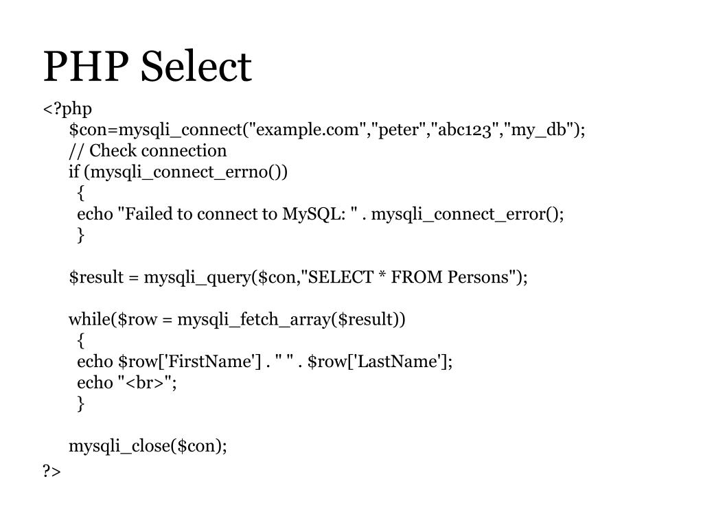 PHP Select <?php$con=mysqli_connect("example.com","peter","abc123","my_db");// Check connectionif (mysqli_connect_errno()) { echo "Failed to connect to MySQL: " . mysqli_connect_error(); }$result = mysqli_query($con,"SELECT * FROM Persons");while($row = mysqli_fetch_array($result)) { echo $row['FirstName'] . " " . $row['LastName']; echo "<br>"; }mysqli_close($con); ?>