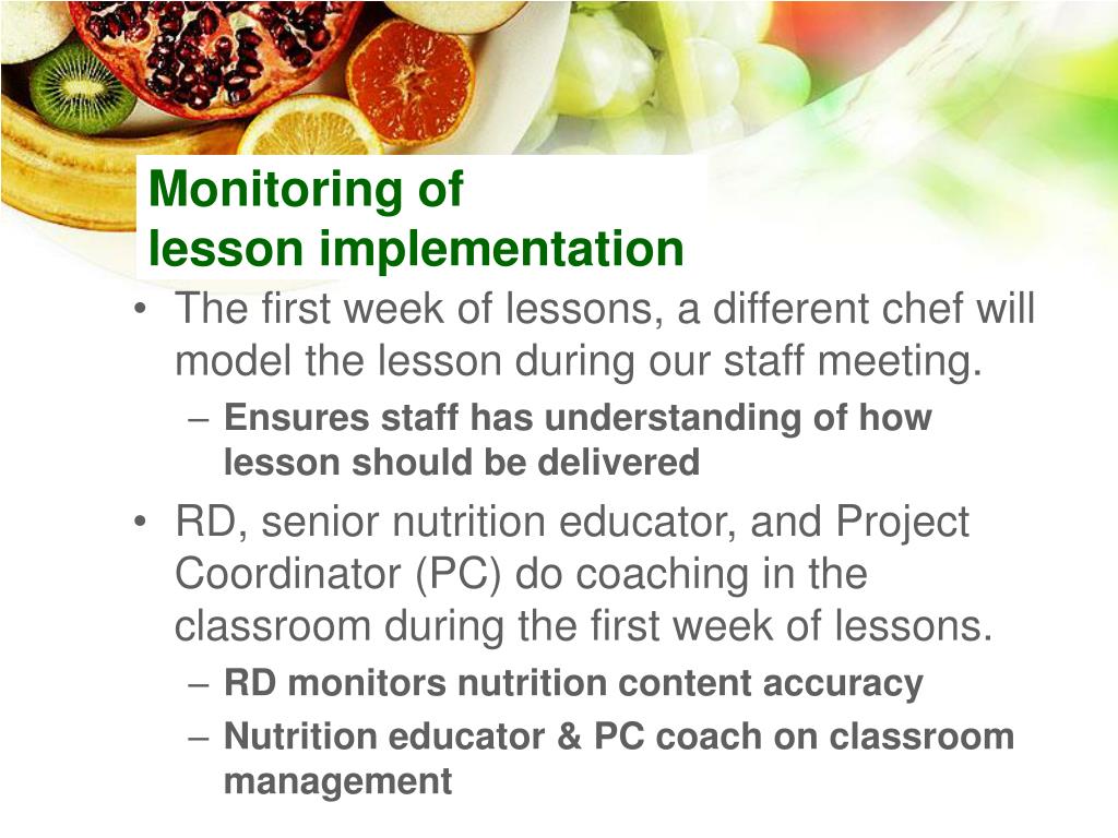 Monitoring of lesson implementation • The first week of lessons, a different chef will model the lesson during our staff meeting. • Ensures staff has understanding of how lesson should be delivered • RD, senior nutrition educator, and Project Coordinator (PC) do coaching in the classroom during the first week of lessons. • RD monitors nutrition content accuracy • Nutrition educator & PC coach on classroom management