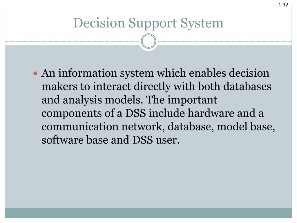 Decision Support System • An information system which enables decision makers to interact directly with both databases and analysis models. The important components of a DSS include hardware and a communication network, database, model base, software base and DSS user.