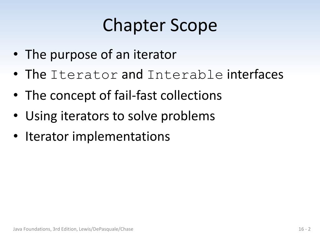 Chapter 16 Iterators. Chapter Scope. The purpose of an iterator The Iterator and Interable interfaces The concept of fail-fast collections Using iterators to solve problems Iterator implementations. Iterators.