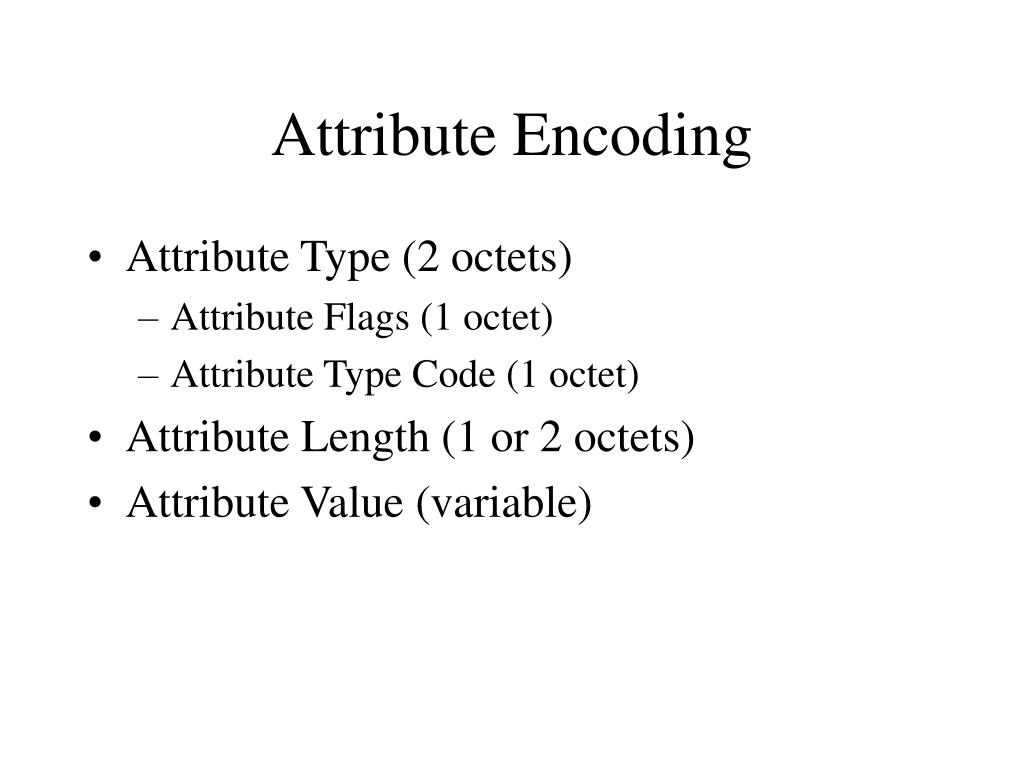 Attribute Encoding • Attribute Type (2 octets) • Attribute Flags (1 octet) • Attribute Type Code (1 octet) • Attribute Length (1 or 2 octets) • Attribute Value (variable)