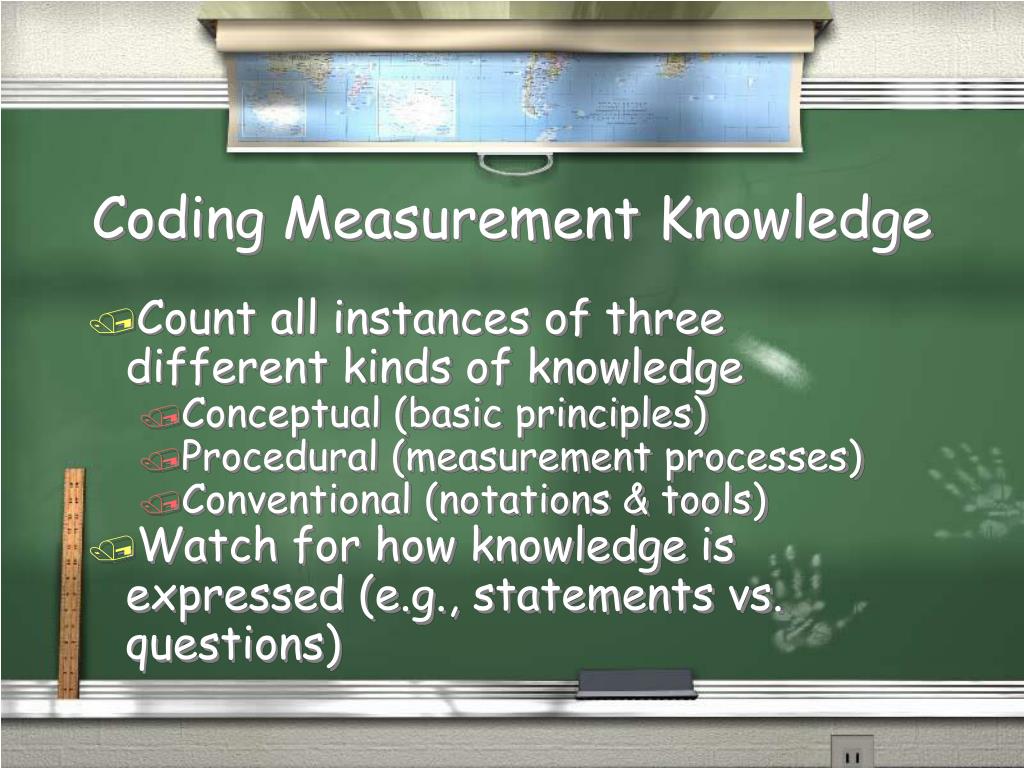 Coding Measurement Knowledge • Count all instances of three different kinds of knowledge • Conceptual (basic principles) • Procedural (measurement processes) • Conventional (notations & tools) • Watch for how knowledge is expressed (e.g., statements vs. questions)