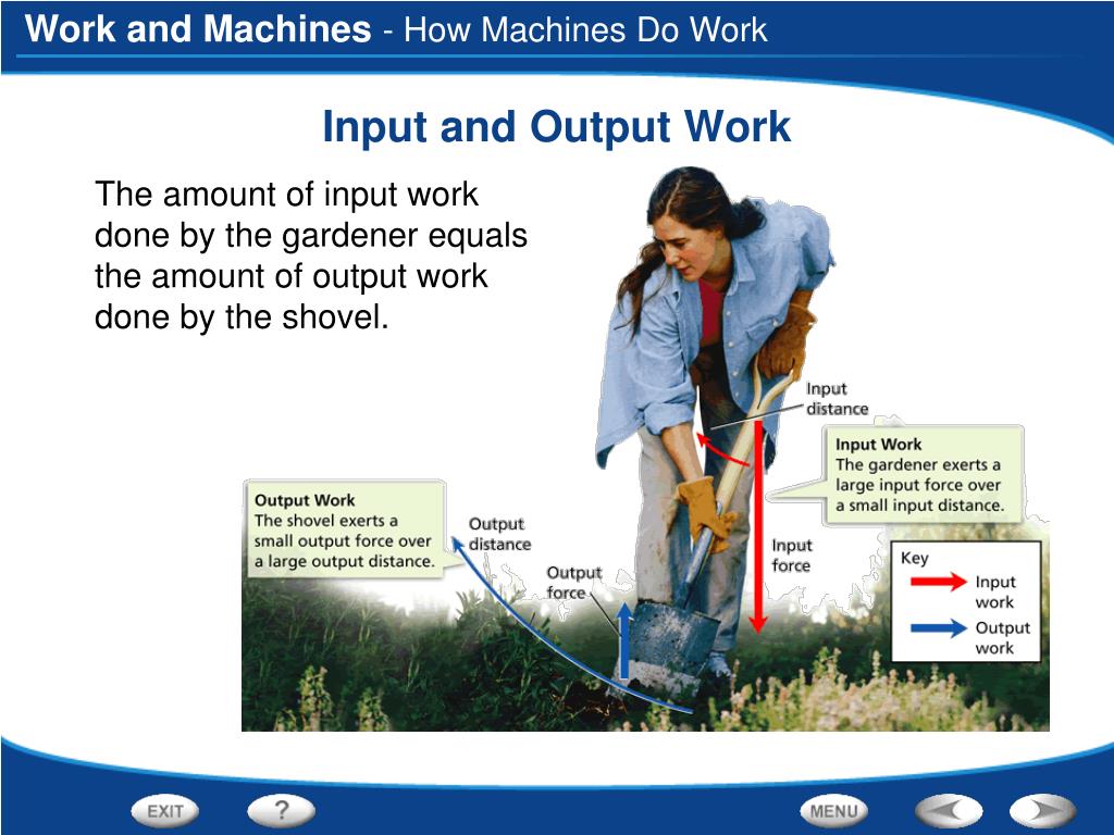 - How Machines Do Work Input and Output Work • The amount of input work done by the gardener equals the amount of output work done by the shovel.
