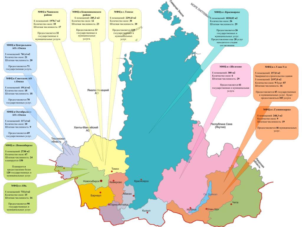 МФЦ в Чаинском районе S помещений: 1970,7 м2 Количество окон: 10 Штатная численность: 17 Предоставляется 32 государственные и муниципальные услуги. МФЦ в Кожевниковском районе S помещений: 285,2 м2 Количество окон: 12 Штатная численность: 23 Предоставляется 33 государственные и муниципальные услуги. МФЦ в г.Томске S помещений: 2291,8 м2 Количество окон: 30 Штатная численность: 10 Предоставляется 118 государственных и муниципальных услуг. МФЦ в г.Красноярске S помещений: 1030,02 м2 Количество окон: 26 Штатная численность: 29 Предоставляется 26 государственных и муниципальных услуг. Предоставление еще 28 услуг находится в стадии согласования МФЦ в Центральном АО г.Омска S помещений: 761,4 м2 Количество окон: 21 Штатная численность: 20 Предоставляется 71 государственная услуга. МФЦ в г.Шелехове S помещений: 300 м2 Количество окон: 6 Штатная численность: 29 Предоставляется 61 государственная и муниципальная услуга МФЦ в г.Улан-Удэ S помещений: 157,8 м2 Завершается строительство здания S помещений: 2197,8 м2 Количество окон: 9 будет 87 Штатная численность: 16 Предоставляется 45 государственных и муниципальных услуг. Будет предоставляться 103 услуги МФЦ в Советском АО г.Омска S помещений: 191,6 м2 Количество окон: 18 Штатная численность: 18 Предоставляется 70 государственных услуг. МФЦ в г.Гусиноозерске S помещений: 248,3 м2 Количество окон: 9 Штатная численность: 19 Предоставляется 46 муниципальных услуг. МФЦ в Октябрьском АО г.Омска S помещений: 117,4 м2 Количество окон: 10 Штатная численность: 9 Предоставляется 69 государственных услуг. МФЦ в г.Новосибирске S помещений: 2730 м2 Количество окон: 67 Штатная численность: 24 планируется 150 Планируется предоставление более 120 государственных и муниципальных услуг. МФЦ в г.Обь S помещений: 733,4 м2 Количество окон: 15 Штатная численность: 16 Предоставляется 90 государственных и муниципальных услуг.