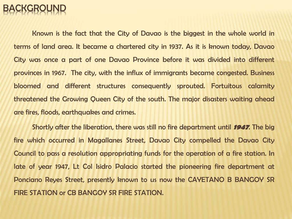 BACKGROUND Known is the fact that the City of Davao is the biggest in the whole world in terms of land area. It became a chartered city in 1937. As it is known today, Davao City was once a part of one Davao Province before it was divided into different provinces in 1967. The city, with the influx of immigrants became congested. Business bloomed and different structures consequently sprouted. Fortuitous calamity threatened the Growing Queen City of the south. The major disasters waiting ahead are fires, floods, earthquakes and crimes. Shortly after the liberation, there was still no fire department until 1947. The big fire which occurred in Magallanes Street, Davao City compelled the Davao City Council to pass a resolution appropriating funds for the operation of a fire station. In late of year 1947, Lt Col Isidro Palacio started the pioneering fire department at Ponciano Reyes Street, presently known to us now the CAYETANO B BANGOY SR FIRE STATION or CB BANGOY SR FIRE STATION.