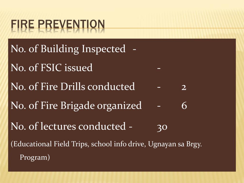 No. of Building Inspected - No. of FSIC issued - No. of Fire Drills conducted - 2 No. of Fire Brigade organized - 6 No. of lectures conducted - 30 (Educational Field Trips, school info drive, UgnayansaBrgy. Program) FIRE PREVENTION