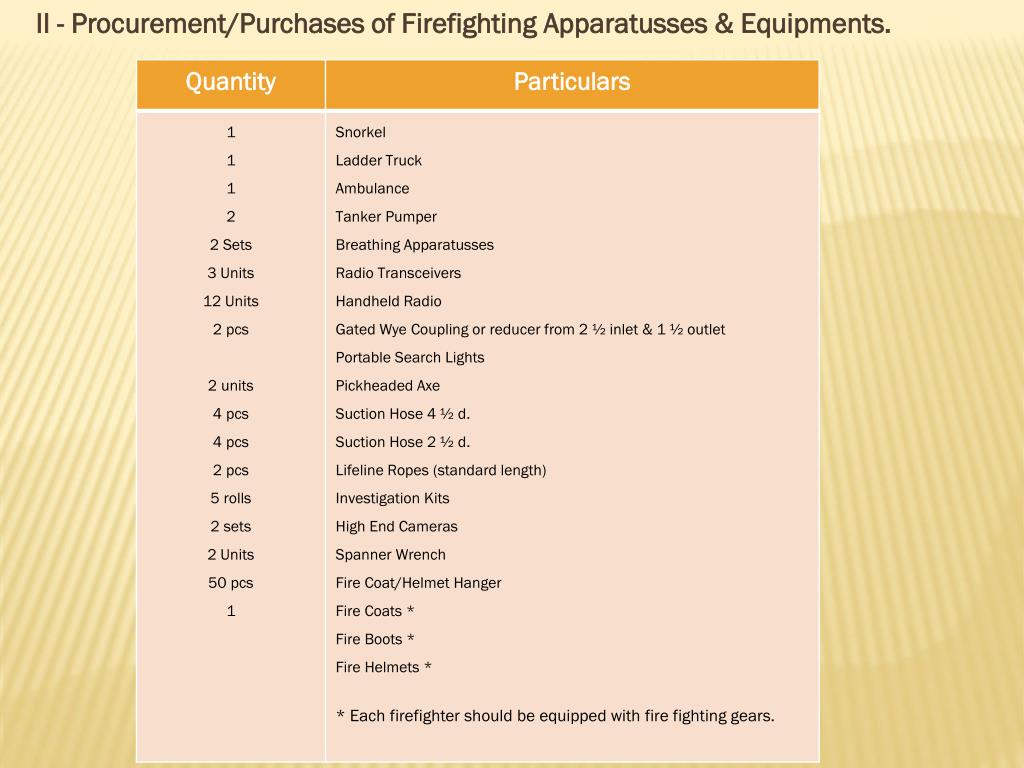 II - Procurement/Purchases of Firefighting Apparatusses & Equipments.