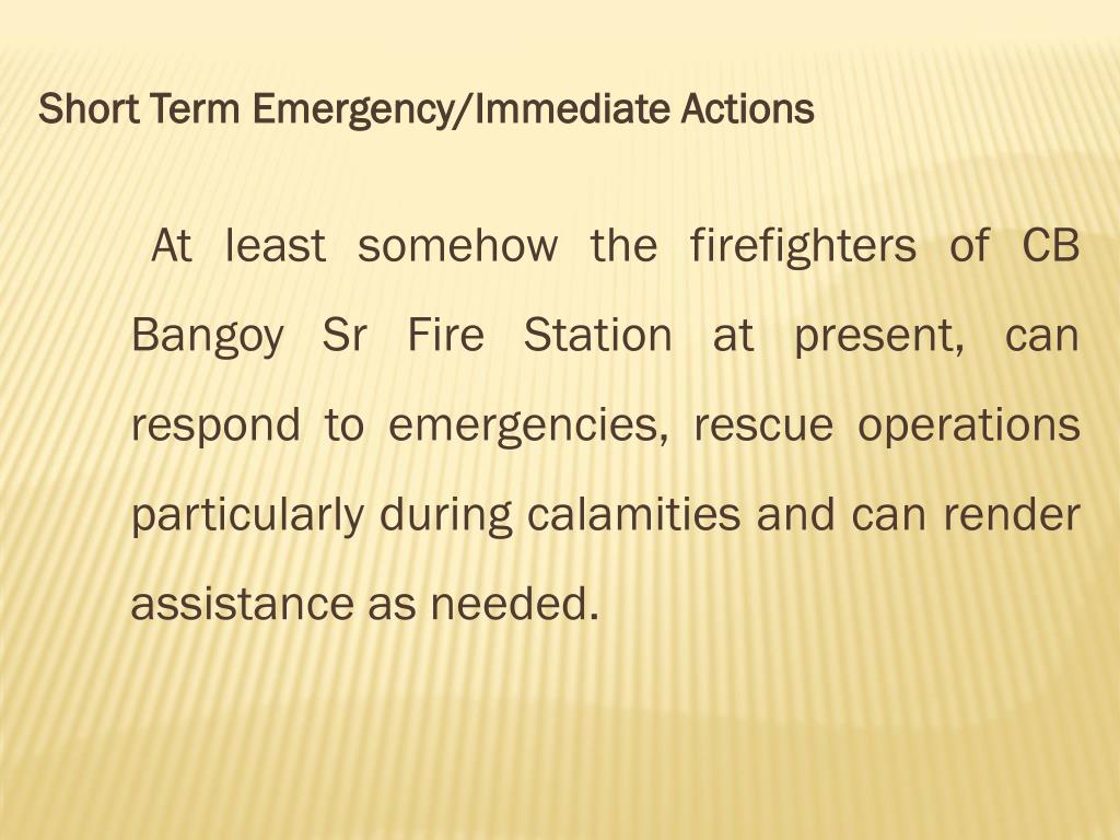 Short Term Emergency/Immediate Actions At least somehow the firefighters of CB BangoySr Fire Station at present, can respond to emergencies, rescue operations particularly during calamities and can render assistance as needed.