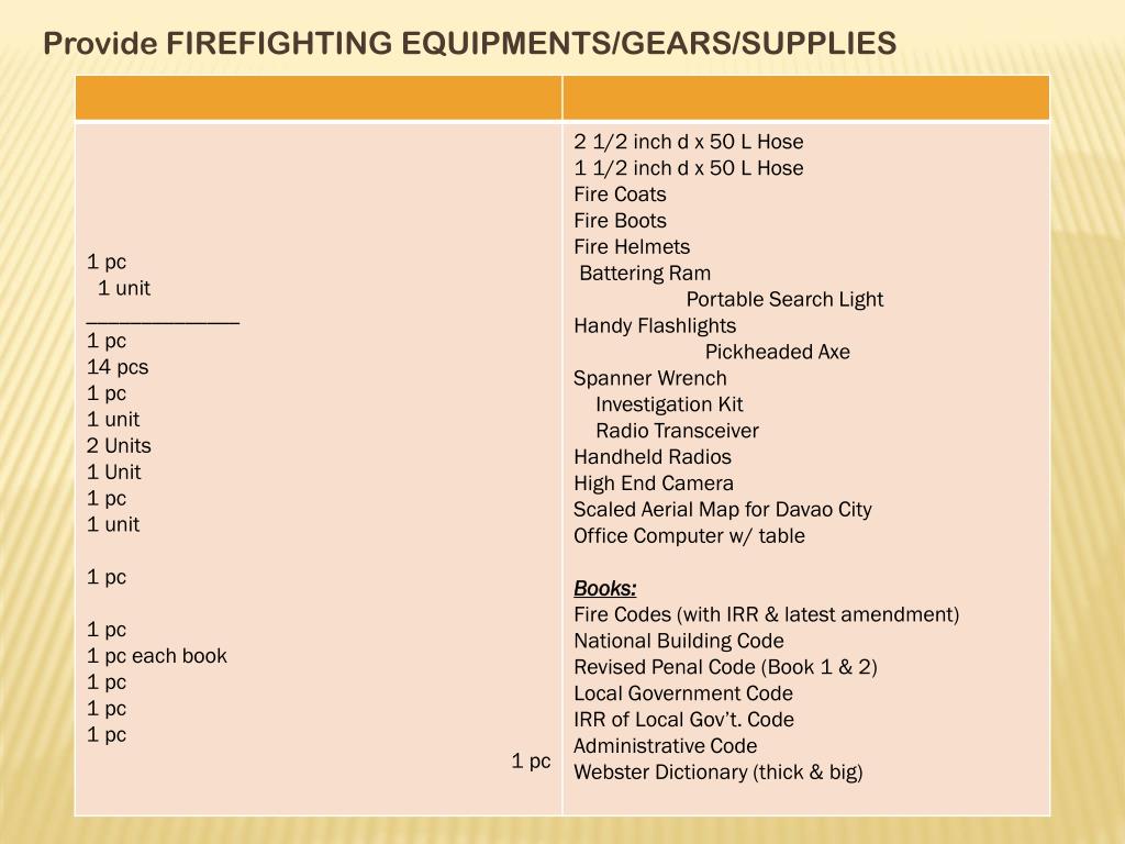Long Term Priority Program In order to attain IDEAL operation capability and efficiency that meets the present and fast economic development of Davao City as a highly urbanized city locally and globally. I – Allocate funds for RENOVATION of the fire station. Now is the right time to show concern to save the effort of our predecessors and campaign for the preservation of the landmark of fire department in Davao City, the monument that stands for the heroism of firemen fighting for the most dreadful fires in the entire Davao. RECOMMENDATIONS