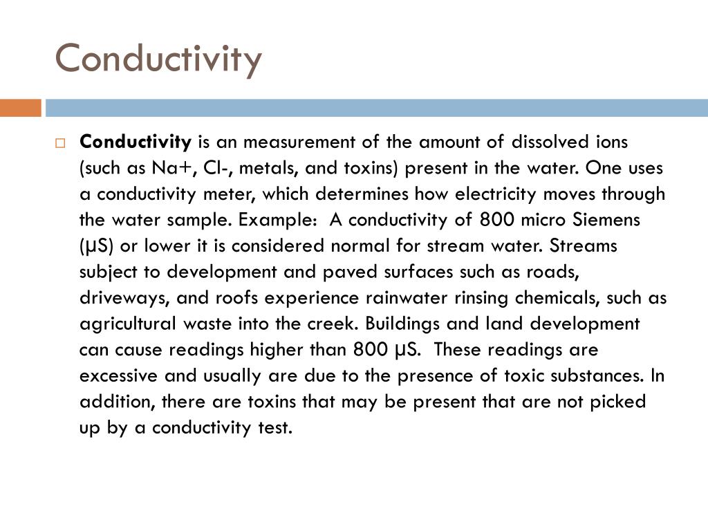 Conductivity • Conductivity is an measurement of the amount of dissolved ions (such as Na+, Cl-, metals, and toxins) present in the water. One uses a conductivity meter, which determines how electricity moves through the water sample. Example: A conductivity of 800 micro Siemens (µS) or lower it is considered normal for stream water. Streams subject to development and paved surfaces such as roads, driveways, and roofs experience rainwater rinsing chemicals, such as agricultural waste into the creek. Buildings and land development can cause readings higher than 800 µS. These readings are excessive and usually are due to the presence of toxic substances. In addition, there are toxins that may be present that are not picked up by a conductivity test.