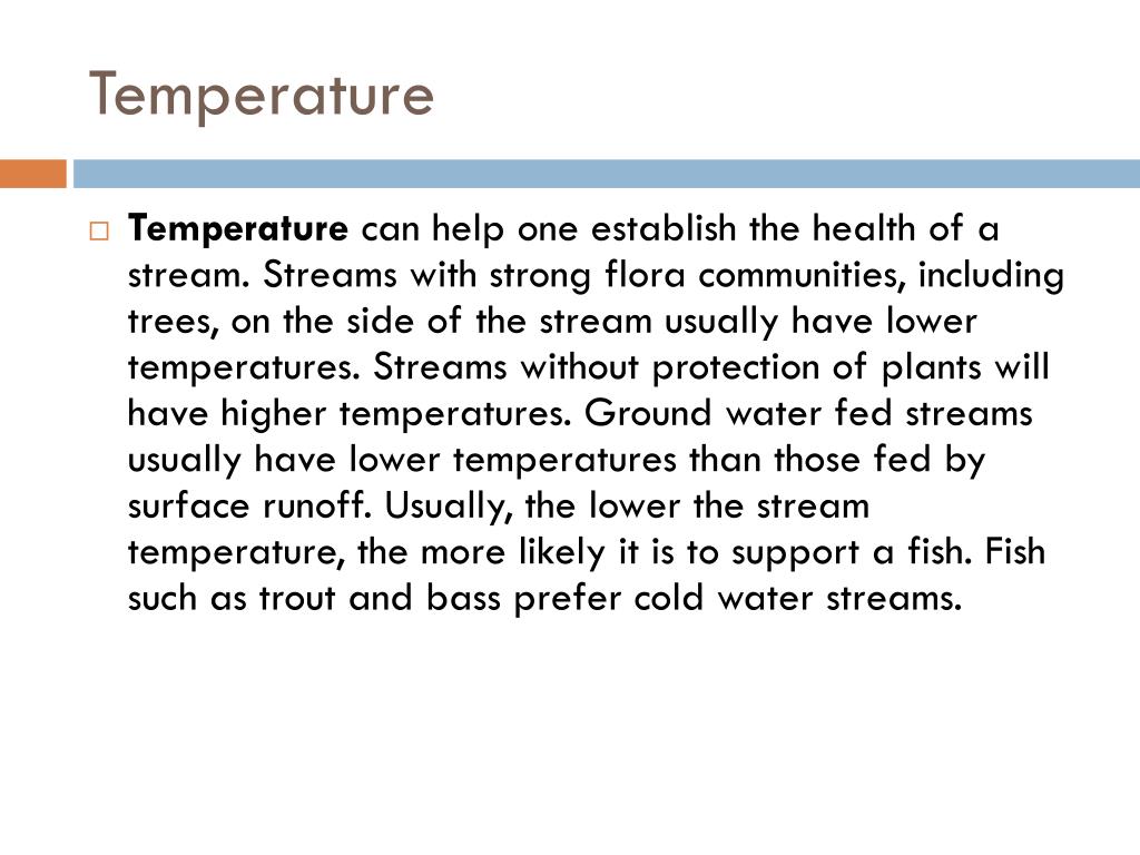 Temperature • Temperature can help one establish the health of a stream. Streams with strong flora communities, including trees, on the side of the stream usually have lower temperatures. Streams without protection of plants will have higher temperatures. Ground water fed streams usually have lower temperatures than those fed by surface runoff. Usually, the lower the stream temperature, the more likely it is to support a fish. Fish such as trout and bass prefer cold water streams.