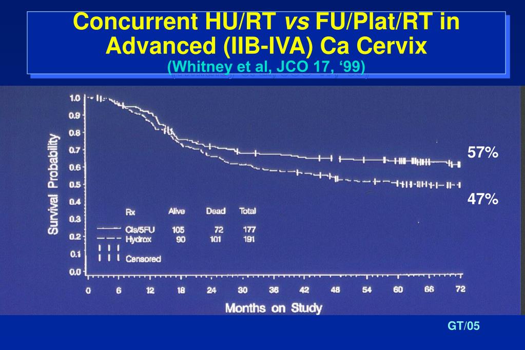 Concurrent HU/RT vs FU/Plat/RT in Advanced (IIB-IVA) Ca Cervix(Whitney et al, JCO 17, ‘99) 57% 47%
