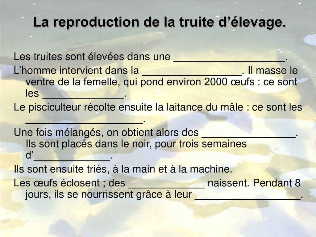 La reproduction de la truite d’élevage. Les truites sont élevées dans une ___________________. L’homme intervient dans la _________________. Il masse le ventre de la femelle, qui pond environ 2000 œufs : ce sont les ______________. Le pisciculteur récolte ensuite la laitance du mâle : ce sont les ____________________. Une fois mélangés, on obtient alors des ________________. Ils sont placés dans le noir, pour trois semaines d’_____________. Ils sont ensuite triés, à la main et à la machine. Les œufs éclosent ; des _____________ naissent. Pendant 8 jours, ils se nourrissent grâce à leur __________________.