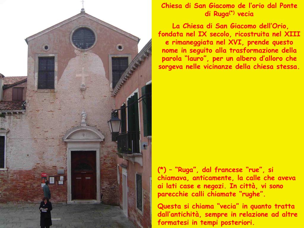 Chiesa di San Giacomo de l’orio dal Ponte di Ruga(*) vecia La Chiesa di San Giacomo dell’Orio, fondata nel IX secolo, ricostruita nel XIII e rimaneggiata nel XVI, prende questo nome in seguito alla trasformazione della parola “lauro”, per un albero d’alloro che sorgeva nelle vicinanze della chiesa stessa. (*) – “Ruga”, dal francese “rue”, si chiamava, anticamente, la calle che aveva ai lati case e negozi. In città, vi sono parecchie calli chiamate “rughe”. Questa si chiama “vecia” in quanto tratta dall’antichità, sempre in relazione ad altre formatesi in tempi posteriori.