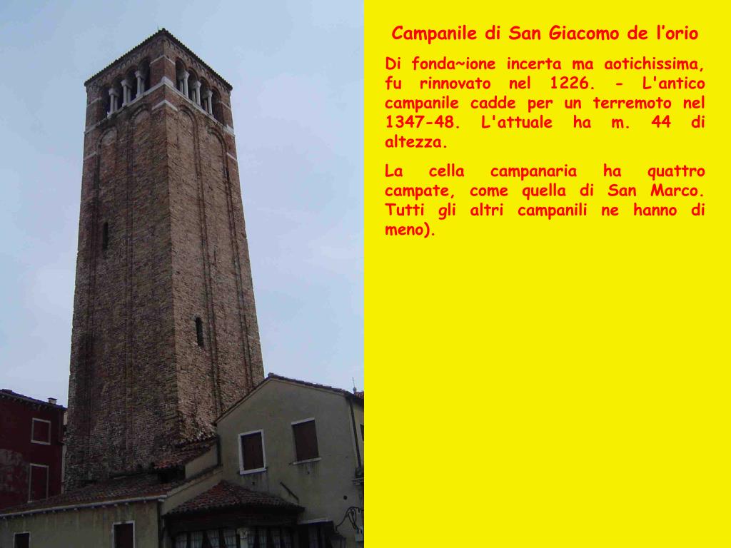 Campanile di San Giacomo de l’orio Di fonda~ione incerta ma aotichissima, fu rinnovato nel 1226. - L'antico campanile cadde per un terremoto nel 1347-48. L'attuale ha m. 44 di altezza. La cella campanaria ha quattro campate, come quella di San Marco. Tutti gli altri campanili ne hanno di meno).