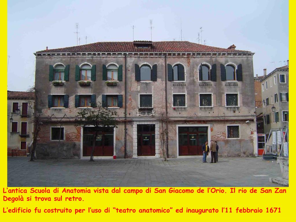 L’antica Scuola di Anatomia vista dal campo di San Giacomo de l’Orio. Il rio de San Zan Degolà si trova sul retro. L’edificio fu costruito per l’uso di “teatro anatomico” ed inaugurato l’11 febbraio 1671