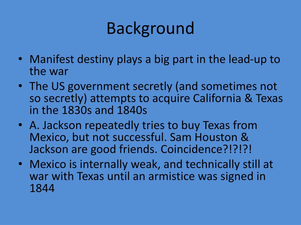 Background • Manifest destiny plays a big part in the lead-up to the war • The US government secretly (and sometimes not so secretly) attempts to acquire California & Texas in the 1830s and 1840s • A. Jackson repeatedly tries to buy Texas from Mexico, but not successful. Sam Houston & Jackson are good friends. Coincidence?!?!?! • Mexico is internally weak, and technically still at war with Texas until an armistice was signed in 1844