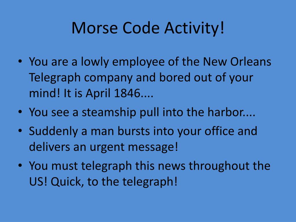 Morse Code Activity! • You are a lowly employee of the New Orleans Telegraph company and bored out of your mind! It is April 1846.... • You see a steamship pull into the harbor.... • Suddenly a man bursts into your office and delivers an urgent message! • You must telegraph this news throughout the US! Quick, to the telegraph!