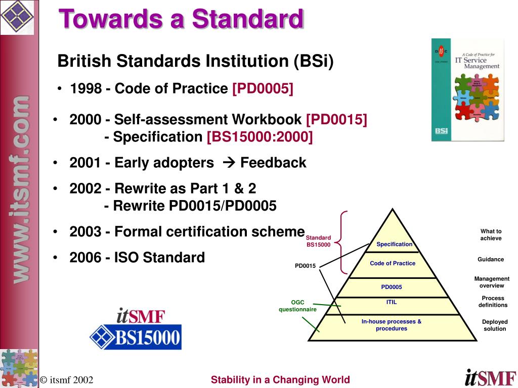 Towards a Standard • British Standards Institution (BSi) • 1998 - Code of Practice [PD0005] • 2000 - Self-assessment Workbook [PD0015] - Specification [BS15000:2000] • 2001 - Early adopters Feedback • 2002 - Rewrite as Part 1 & 2 - Rewrite PD0015/PD0005 • 2003 - Formal certification scheme • 2006 - ISO Standard