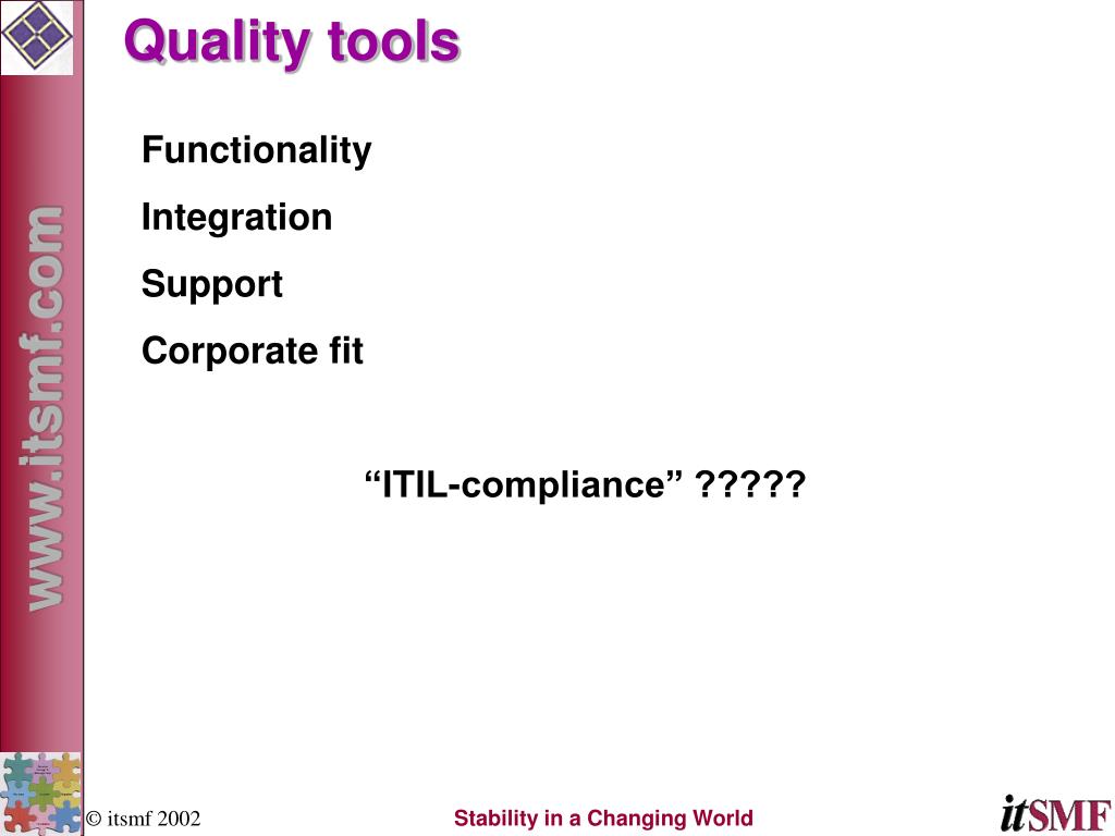 Quality tools Functionality Integration Support Corporate fit “ITIL-compliance” ?????