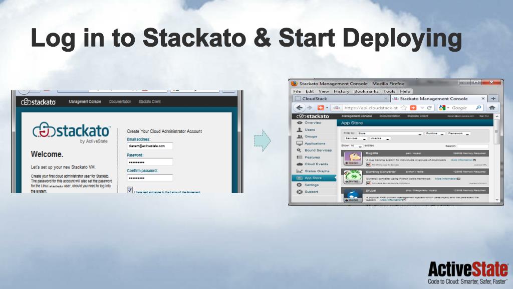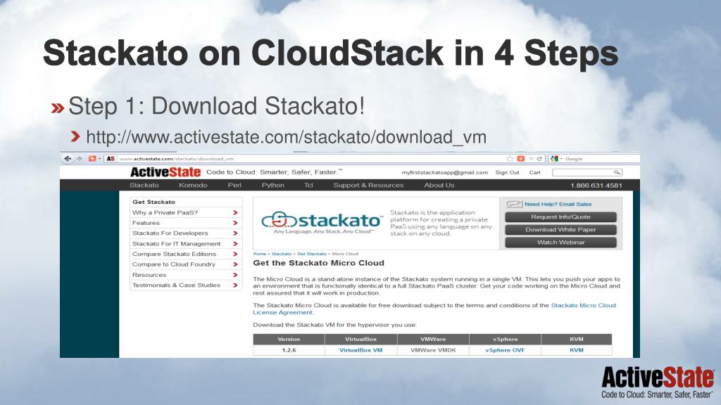Stackato on CloudStackin 4 Steps • Step 1: Download Stackato! • http://www.activestate.com/stackato/download_vm