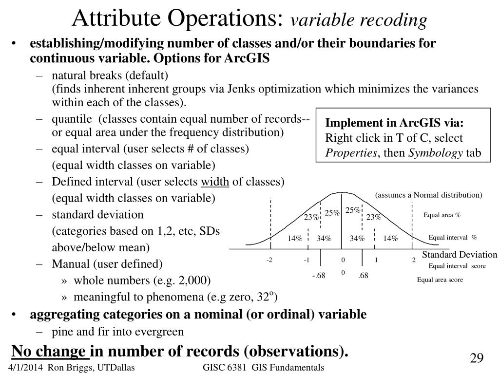 (assumes a Normal distribution) 25% 25% 23% 23% 14% 34% 34% 14% -2 -1 0 1 2 -.68 .68 0 Attribute Operations: variable recoding • establishing/modifying number of classes and/or their boundaries for continuous variable. Options for ArcGIS • natural breaks (default)(finds inherent inherent groups via Jenks optimization which minimizes the variances within each of the classes). • quantile (classes contain equal number of records--or equal area under the frequency distribution) • equal interval (user selects # of classes) (equal width classes on variable) • Defined interval (user selects width of classes) (equal width classes on variable) • standard deviation (categories based on 1,2, etc, SDs above/below mean) • Manual (user defined) • whole numbers (e.g. 2,000) • meaningful to phenomena (e.g zero, 32o) • aggregating categories on a nominal (or ordinal) variable • pine and fir into evergreen No change in number of records (observations). Implement in ArcGIS via: Right click in T of C, select Properties, then Symbology tab Equal area % Equal interval % Standard Deviation Equal interval score Equal area score