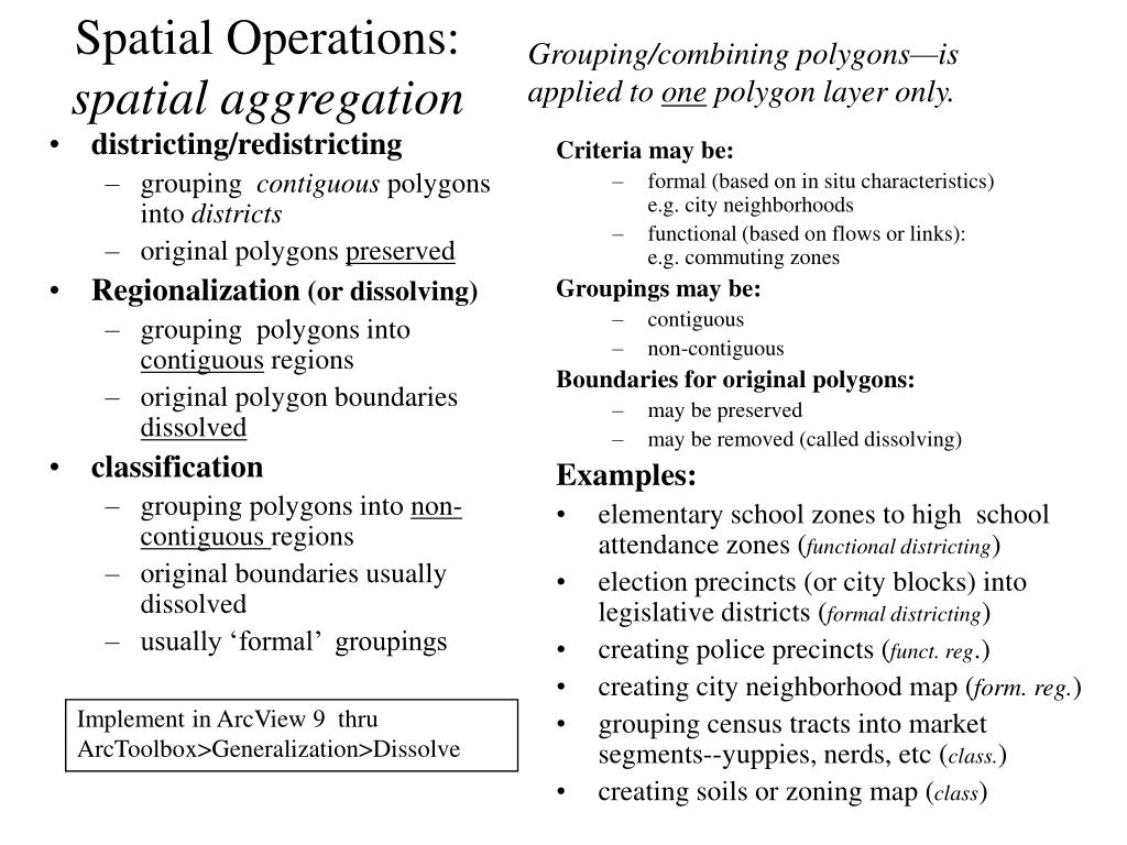 Criteria may be: formal (based on in situ characteristics)e.g. city neighborhoods functional (based on flows or links): e.g. commuting zones Groupings may be: contiguous non-contiguous Boundaries for original polygons: may be preserved may be removed (called dissolving) Examples: elementary school zones to high school attendance zones (functional districting) election precincts (or city blocks) into legislative districts (formal districting) creating police precincts (funct. reg.) creating city neighborhood map (form. reg.) grouping census tracts into market segments--yuppies, nerds, etc (class.) creating soils or zoning map (class) districting/redistricting grouping contiguous polygons into districts original polygons preserved Regionalization (or dissolving) grouping polygons into contiguous regions original polygon boundaries dissolved classification grouping polygons into non-contiguous regions original boundaries usually dissolved usually ‘formal’ groupings Grouping/combining polygons—is applied to one polygon layer only. Spatial Operations: spatial aggregation Implement in ArcView 9 thru ArcToolbox>Generalization>Dissolve