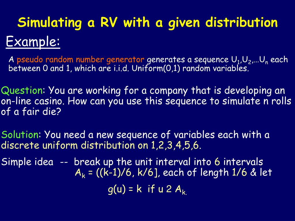 Simulating a RV with a given distribution Example: A pseudo random number generator generates a sequence U1,U2,…Un each between 0 and 1, which are i.i.d. Uniform(0,1) random variables. Question: You are working for a company that is developing an on-line casino. How can you use this sequence to simulate n rolls of a fair die? Solution: You need a new sequence of variables each with a discrete uniform distribution on 1,2,3,4,5,6. Simple idea -- break up the unit interval into 6 intervals Ak = ((k-1)/6, k/6], each of length 1/6 & let g(u) = k if u 2 Ak.